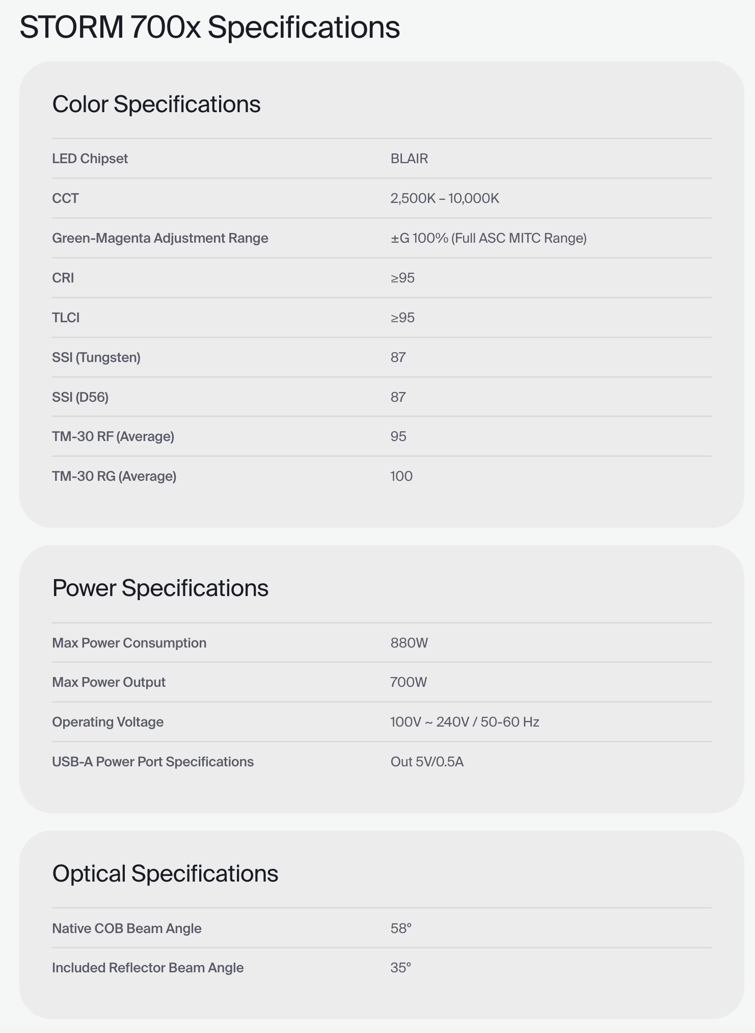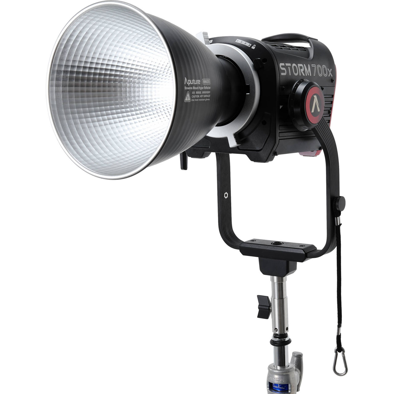 The Aputure STORM 700x utilizes the BLAIR (Blue/Lime/Amber/Indigo/Red) light engine, delivering the highest quality white light and greatest +/- green adjustability of any LED technology. The BLAIR light engine’s indigo emitters enhance fluorescing materials like natural daylight and tungsten sources.