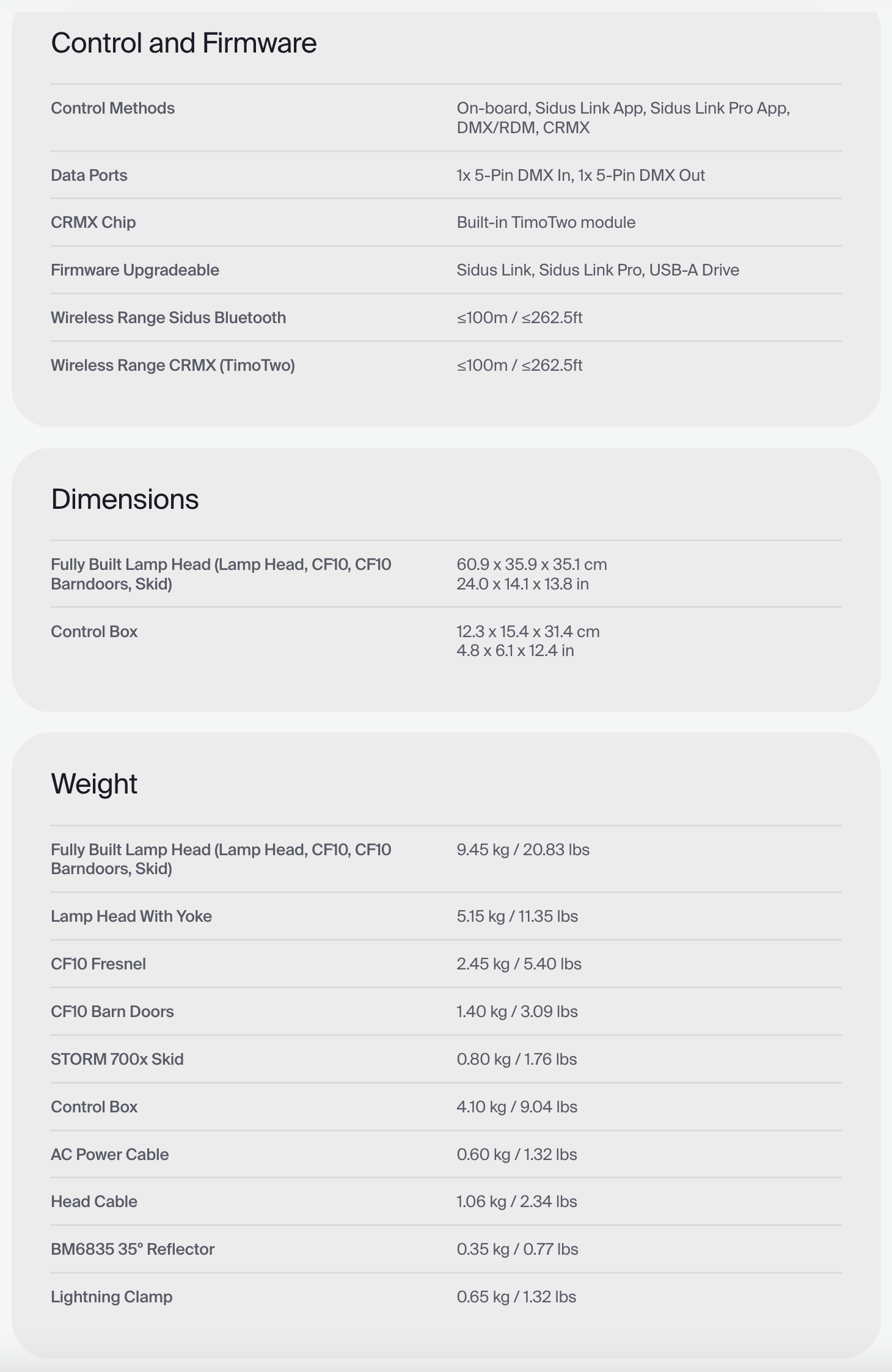 The STORM 700x features wireless control with Sidus Bluetooth Mesh, CRMX, and 5-Pin DMX for use with professional lighting control software.