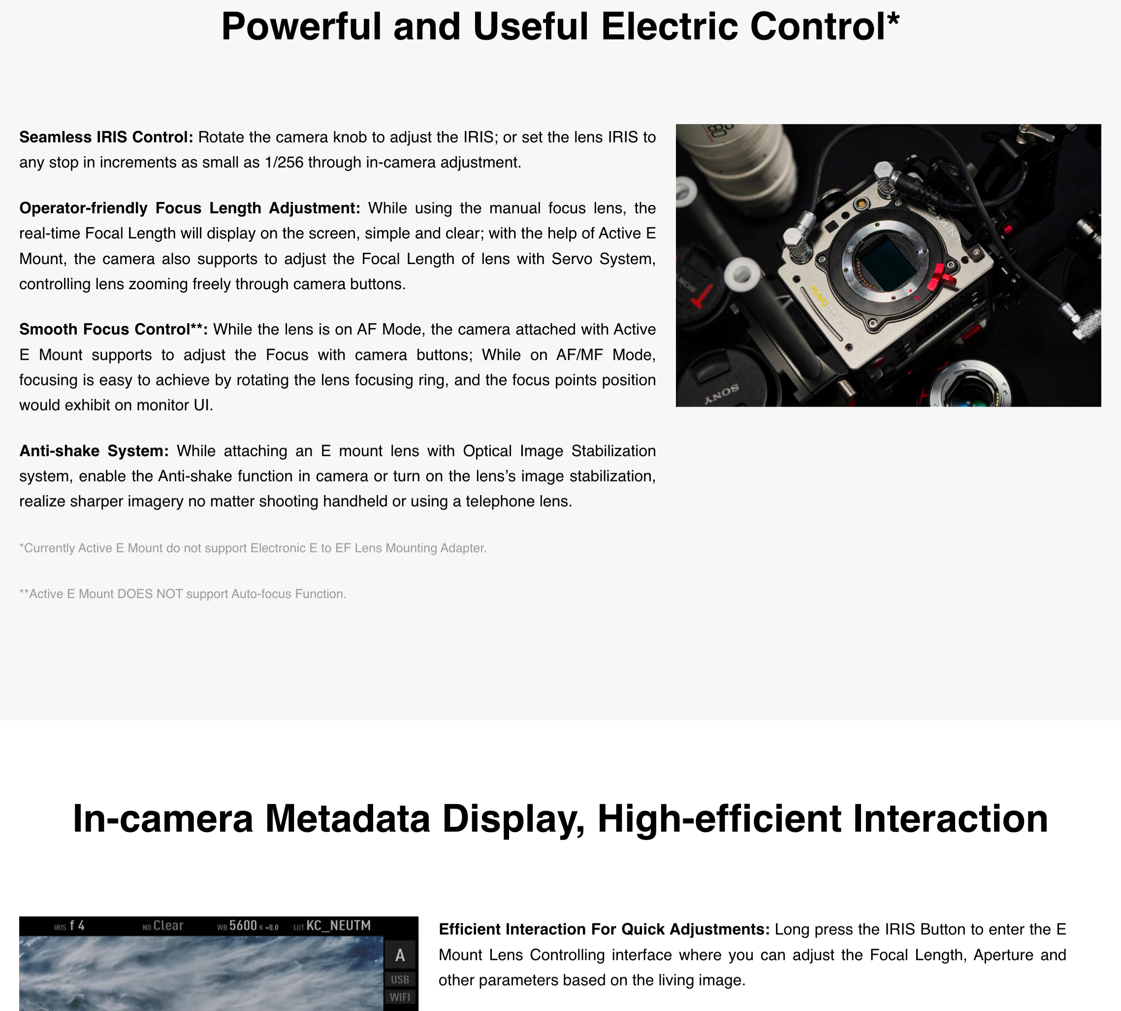 Compared with the passive E mounting adapter, Active E Mount with electronic contacts allows in-camera control of IRIS, focal length, focus and lens image stabilization, bringing sharper imagery and more efficient workflow.