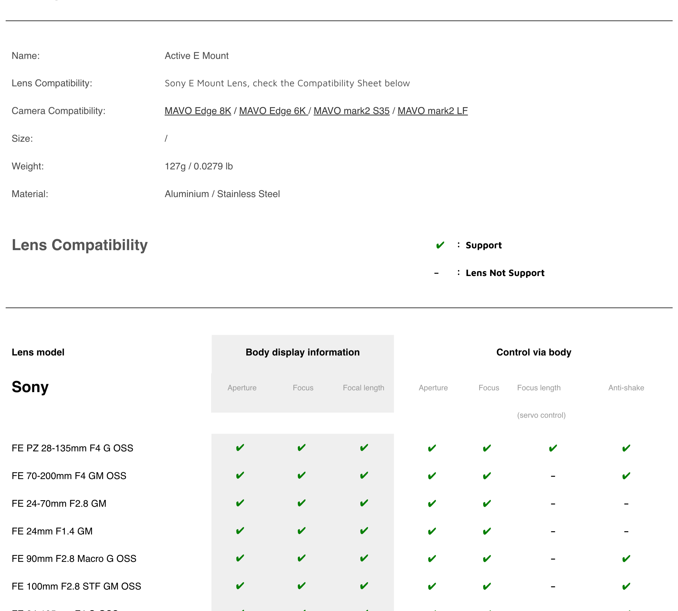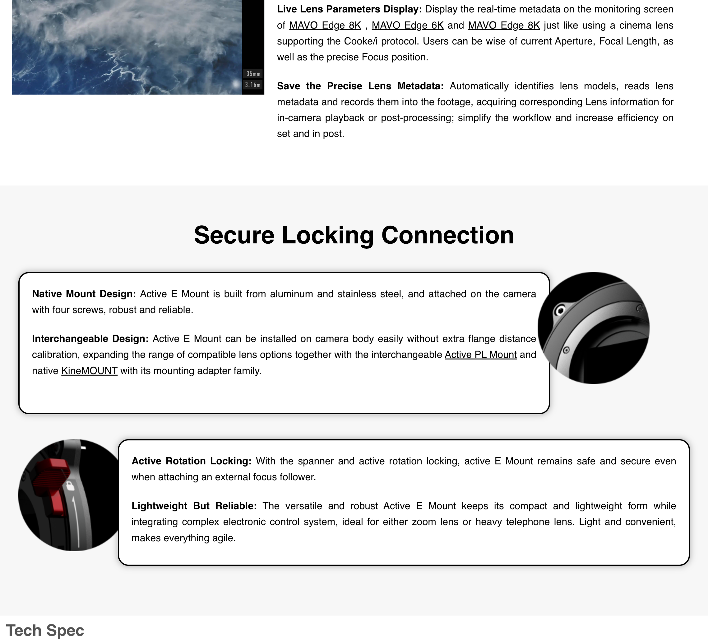 KINEFINITY newly introduced the Active E Mount that can work smoothly with MAVO Edge and MAVO mark2 camera. Active E Mount supports electronic control and enables you to attach your Sony E mount lens to the MAVO Edge camera, extending the range of compatible lens options.