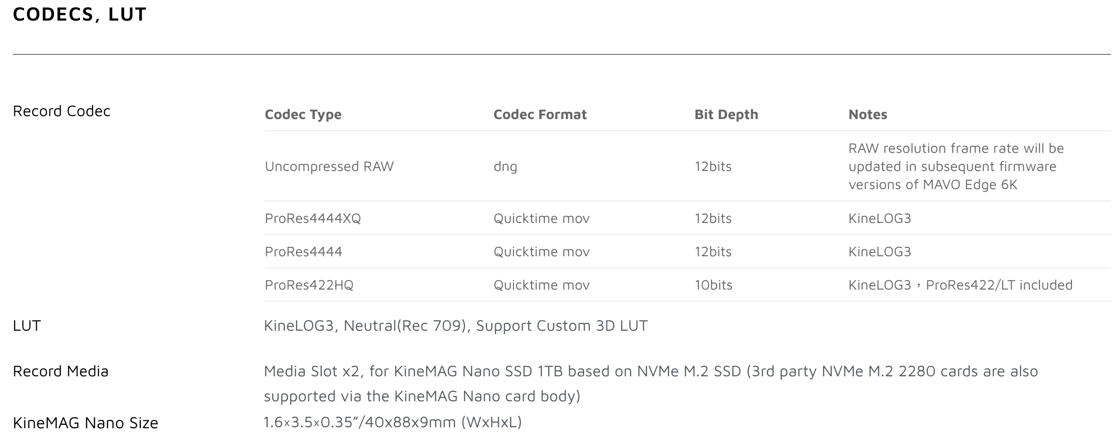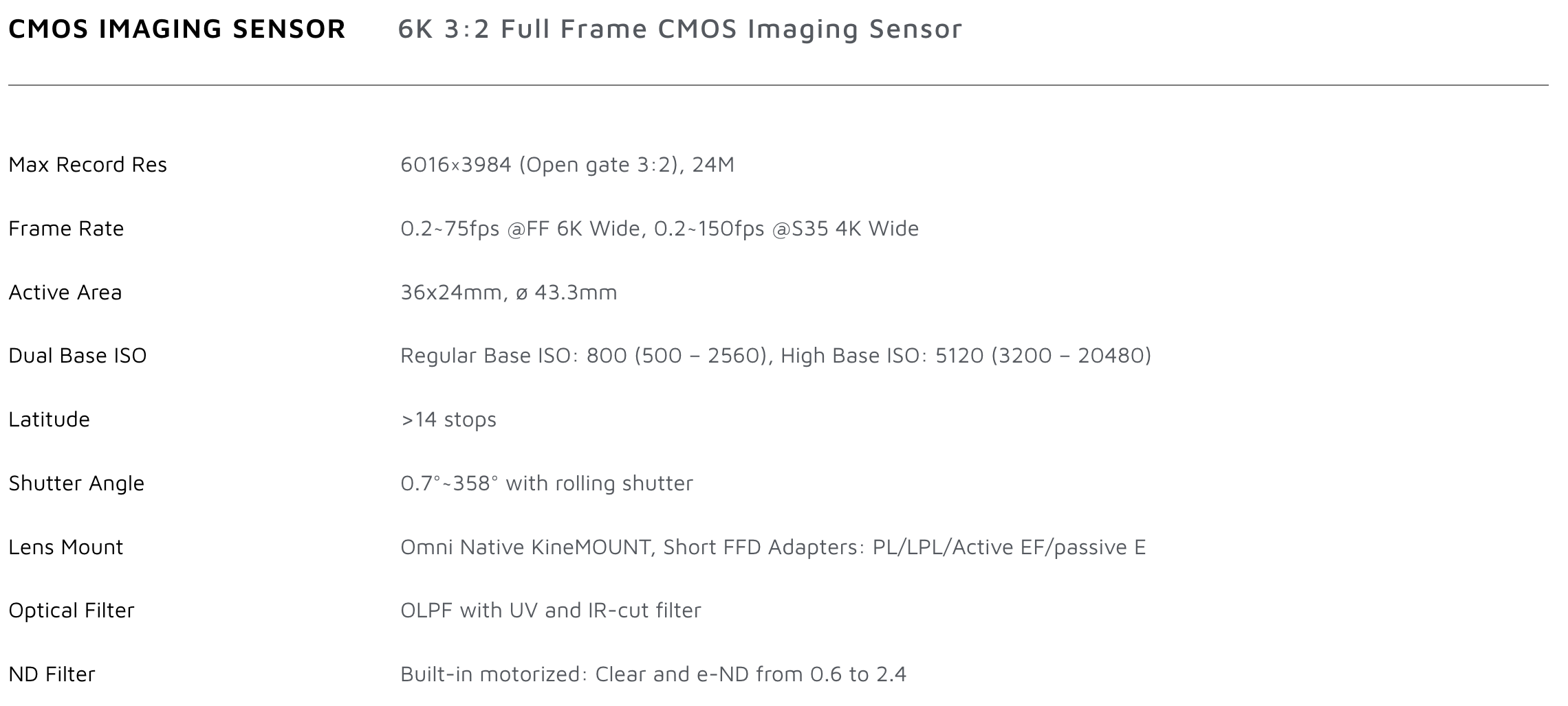 | FF 6K 2.4:1 | 6016×2520, 0.2~75fps | ProRes | 36×15.2mm, ø 39.1mm |