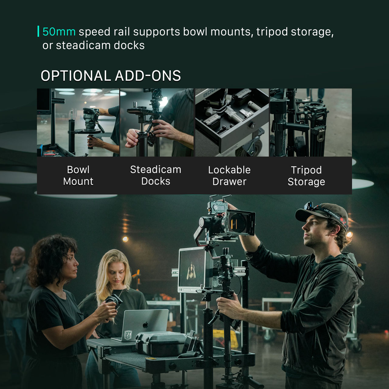 - A wide range of optional accessories that let you expand the cart into a camera workstation, focus pulling station, DIT hub, or even a mobile workshop