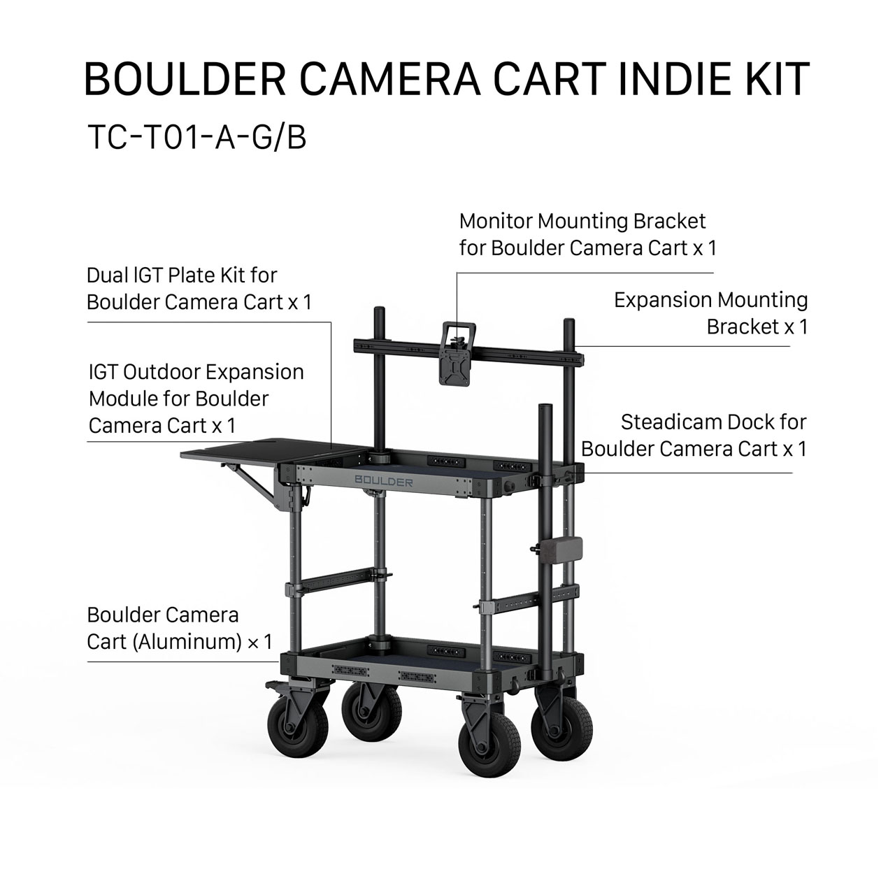 For those looking for a ready-to-use setup, the Boulder Camera Cart Indie Kit builds on the base model with included upgrades: